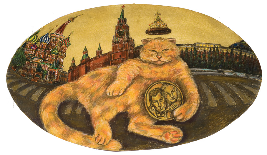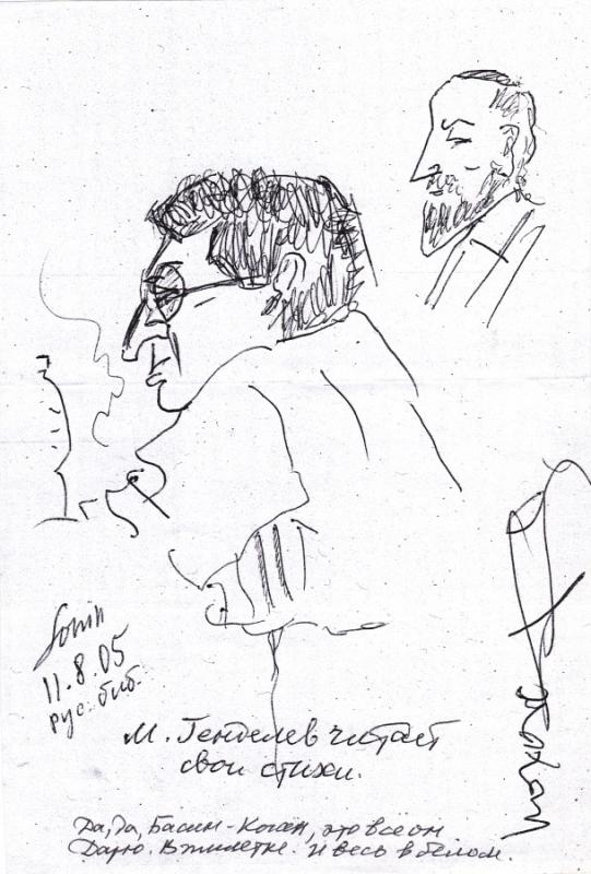 Валерий Корнблит (Сонин). М. Генделев читает свои стихи. Карандаш набумаге. 2005 Лена Зайдель. Кот (с портретом М.Генделева и Н.Коноплевой) Сухая пастель на бумаге (45 Х 130 см) 2009